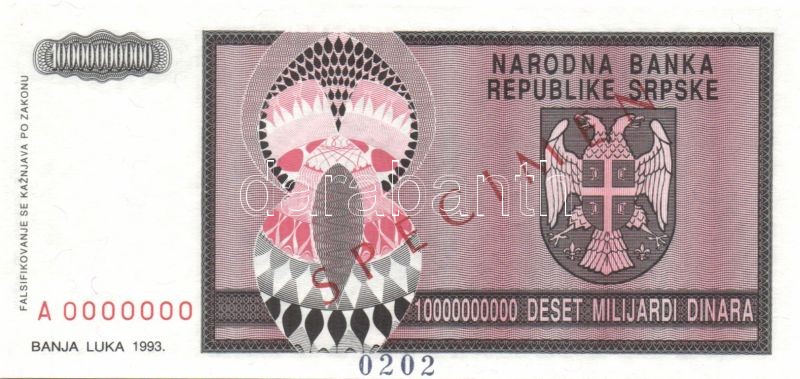 Beschreibung: Bosznia Hercegovina/Szerb Köztársaság 1992. 5000D "SPECIMEN-0000" (Minta) + 1993. 10.000.000.000D "SPECIMEN-0000" (Minta) T:I