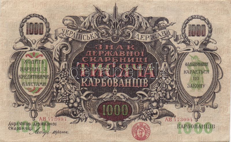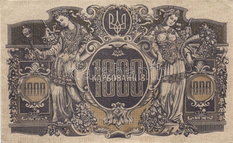 Ukrajna 1918. 1000K T:I- saroktörés https://www.darabanth.com/de/92-Fernauktion/92.0/Numismatik/~296/Ukrajna-1918-1000K-TI-saroktores~II207052