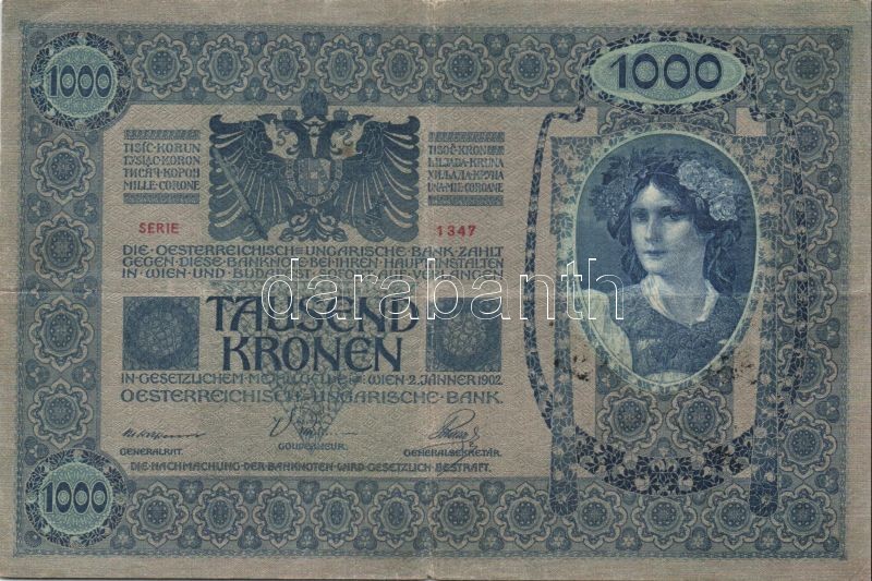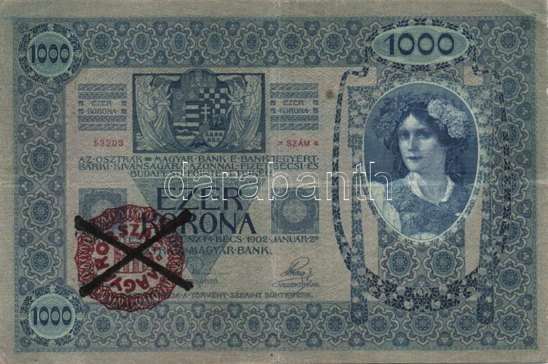 1902. 1000K piros "Magyarország" körbélyegzővel + fekete "Andráskeresz... https://www.darabanth.com/de/92-Fernauktion/92.0/Numismatik/~297/1902-1000K-piros-Magyarorszag-korbelyegzovel-plus-fekete-Andraskereszt-ervenytelenitessel~II207456
