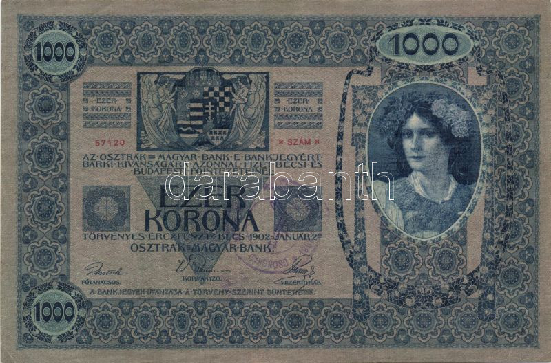 Beschreibung: 1902. 1000K szerb ellenbélyeggel és mindkét oldalon"Csongrád Vármegye..." ellenbélyegzővel T:I- pici sarokhiba