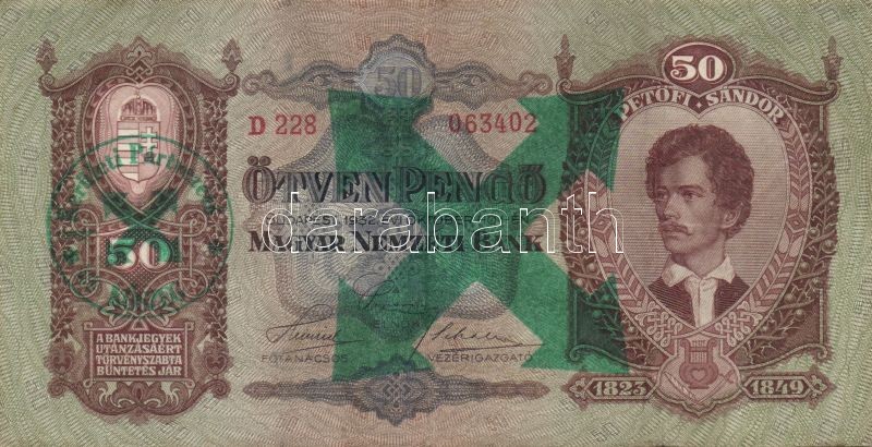 Beschreibung: 1930-1941. 100P zöld nyilaskeresztes fny-sal + 20P, 50P, 100P zöld "Kerületi Pártvezető Kőszeg" + nyilaskereszt fny-sal + 10P, 20P, 50P, 100P zöld "Kerületi Pártvezető Kőszeg" fny-sal T:II,III Összesen 8klf db!