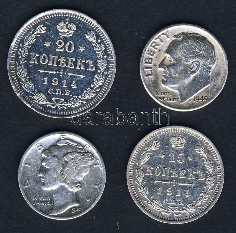 Oroszország 1914. 15k Ag, 20k Ag T:2 ph + USA 1941. 10c Ag "Mercury" (... https://www.darabanth.com/de/92-Fernauktion/92.0/Numismatik/~304/Oroszorszag-1914-15k-Ag-20k-Ag-T2-ph-plus-USA-1941-10c-Ag-Mercury-1x-plus-1949-10c-Ag-Roosevelt~II205524