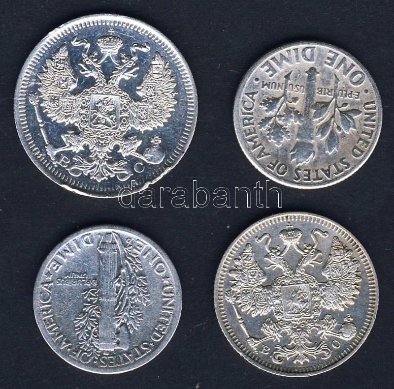 Beschreibung: Oroszország 1914. 15k Ag, 20k Ag T:2 ph + USA 1941. 10c Ag "Mercury" (1x) + 1949. 10c Ag "Roosevelt" (1x) T:2/3 Összesen 4klf db Ag!