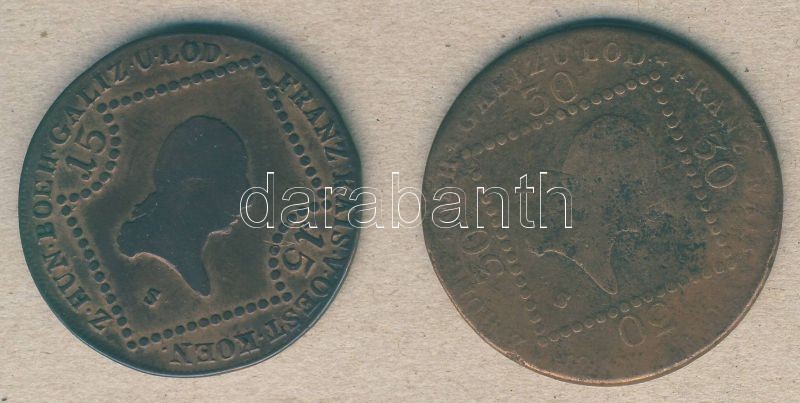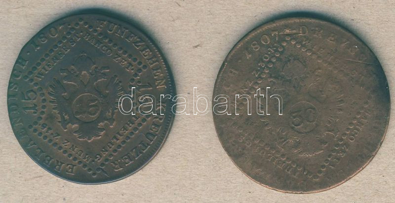 Ausztria/magyar verdejel 1807S 15kr + 30kr T:3 https://www.darabanth.com/de/92-Fernauktion/92.0/Numismatik/~305/Ausztriamagyar-verdejel-1807S-15kr-plus-30kr-T3~II205291