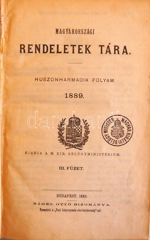 1889 Magyarországi rendeletek tára; M. kir. belügyminisztérium kiadása https://www.darabanth.com/de/93-Fernauktion/93.0/Andere-Sammelgebiete/~5306/1889-Magyarorszagi-rendeletek-tara-M-kir-belugyminiszterium-kiadasa~II212447