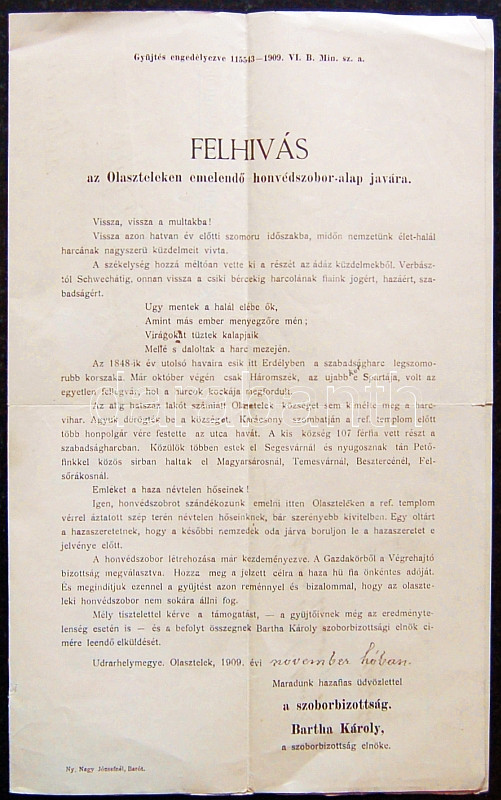 Beschreibung: 1909 Gyűjtőív az Olasztelken felállítandó honvédszobor javára (nyomtatványként elküldve)