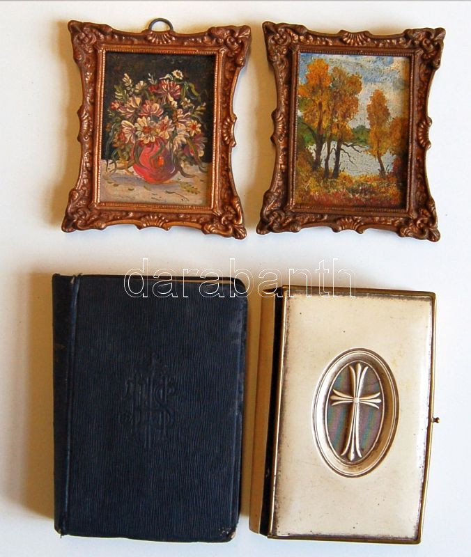 Beschreibung: cca 1890-1930: 2 db imakönyv + 2 kisméretű fémkeretes, fém hátterű kép
