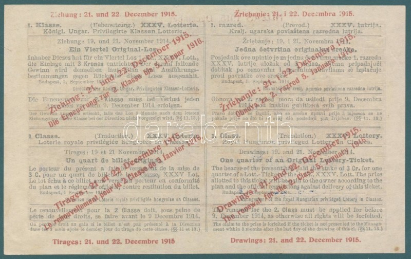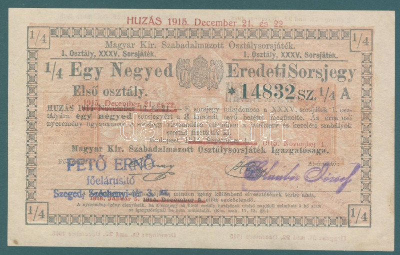1915. "35. M.Kir. Szabadalmazott Osztálysorsjáték" 1/4 Eredeti Sorsjeg... https://www.darabanth.com/de/93-Fernauktion/93.0/Numismatik/~5313/1915-35-MKir-Szabadalmazott-Osztalysorsjatek-14-Eredeti-Sorsjegye-8K-rol-kek-Peto-ErnC5~II214408