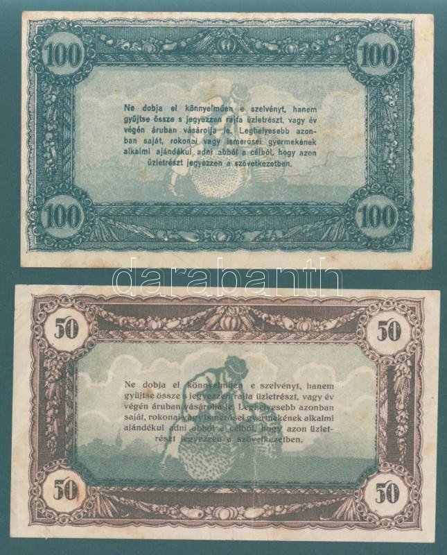 Beschreibung: 1920-as évek eleje 50K + 100K vásárlási visszatérítés lila "Kalocsai Hangya fogy. és ért." bélyegzővel T:I-,II