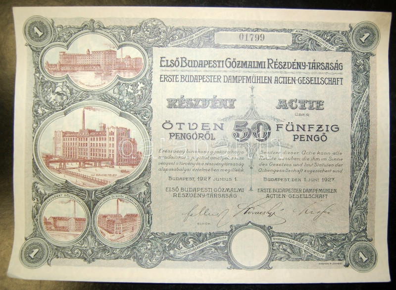 1927. "Első Budapesti Gőzmalmi Részvény-Társaság" részvénye 50P-ről https://www.darabanth.com/de/93-Fernauktion/93.0/Numismatik/~5313/1927-Elso-Budapesti-Gozmalmi-Reszveny-Tarsasag-reszvenye-50P-rol~II205550