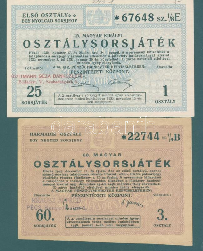1931. "25. M. Kir. Osztálysorsjáték" 1/8 sorsjegye piros "Guttmann Géza.." bélyegzővel T:I- + 1947. "60. M. Kir. Osztálysorsjáték" 1/4 sorsjegye lila "Krausz Alfréd.." bélyegzővel T:II-