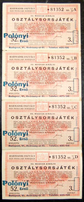 1944. "52. Magyar Királyi Osztálysorsjáték" 1/8 sorsjegye kék "Polónyi Ernő.." bélyegzővel, 4-es összefüggő, függőleges csíkban T:összefüggéseknél hajtott, egyébként I