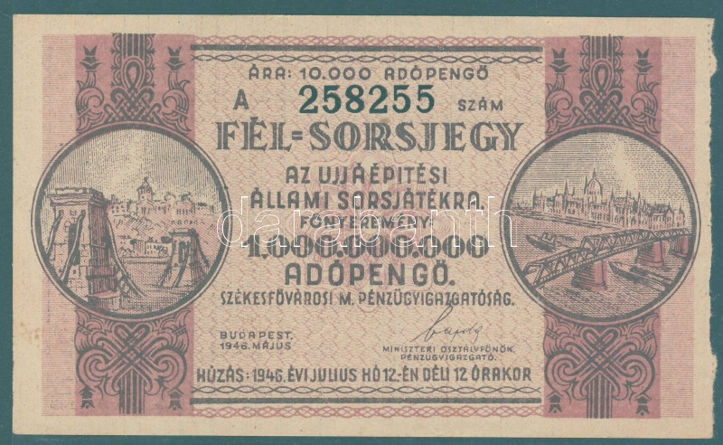 1946. "Állami Sorsjáték" fél-sorsjegy 1000.000.000AP-ről T:I https://www.darabanth.com/de/93-Fernauktion/93.0/Numismatik/~5313/1946-Allami-Sorsjatek-fel-sorsjegy-1000000000AP-rol-TI~II214388