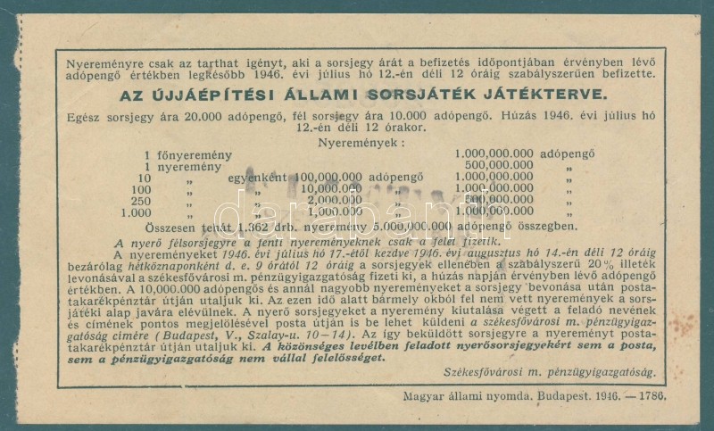 Beschreibung: 1946. "Állami Sorsjáték" fél-sorsjegy 1000.000.000AP-ről T:I