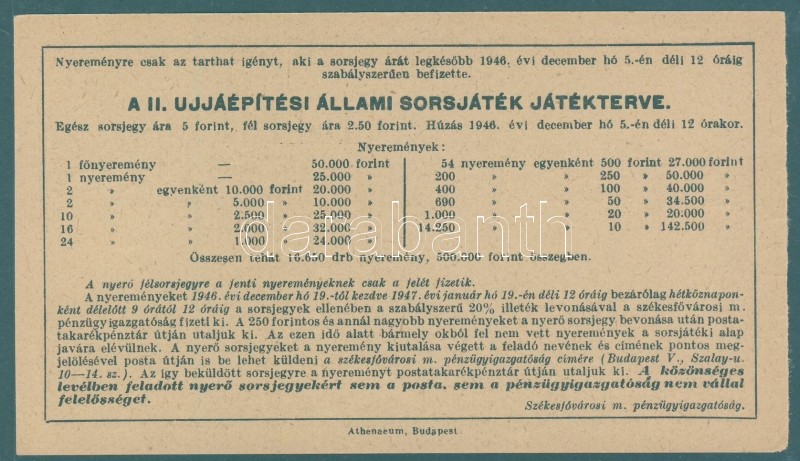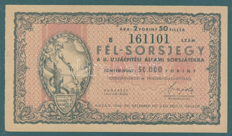 1946. "II. Állami Sorsjáték" fél-sorsjegy 50.000Ft-ról T:I https://www.darabanth.com/de/93-Fernauktion/93.0/Numismatik/~5313/1946-II-Allami-Sorsjatek-fel-sorsjegy-50000Ft-rol-TI~II214387