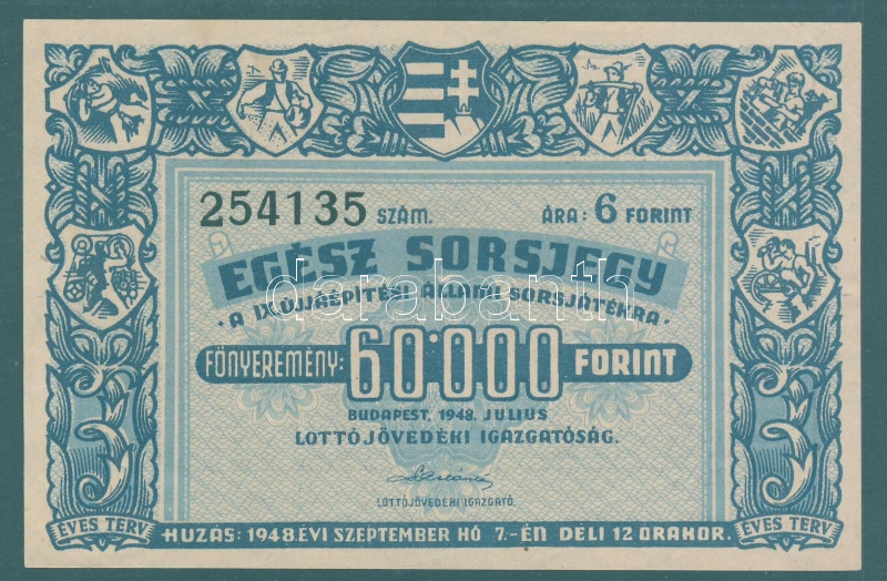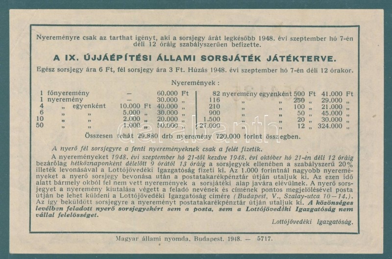 Beschreibung: 1948. "IX. Állami Sorsjáték" egész sorsjegy 60.000Ft-ról T:I