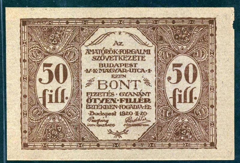 Beschreibung: Budapest 1920. "Amatőrök Forgalmi Szövetkezete" bónja 50f-ről T:I