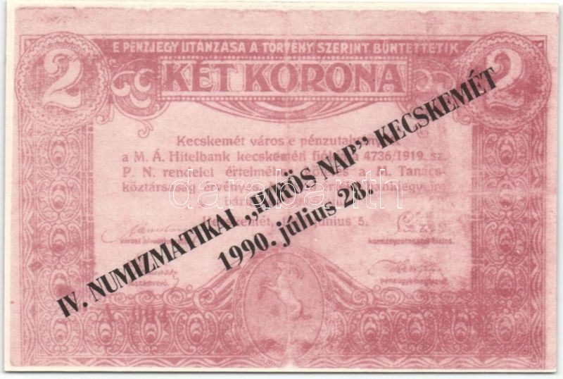 Kecskemét 1919. 2K fénymásolatára nyomott "IV. Numizmatikai "Hirös Nap... https://www.darabanth.com/de/93-Fernauktion/93.0/Numismatik/~5314/Kecskemet-1919-2K-fenymasolatara-nyomott-IV-Numizmatikai-Hiros-Nap-Kecskemet-1990-juliu~II207311