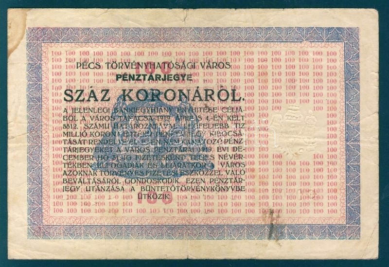 Pécs 1919. Pénztárjegy 100K-ról "*"-gal, szárazbélyegzővel T:III https://www.darabanth.com/de/93-Fernauktion/93.0/Numismatik/~5314/Pecs-1919-Penztarjegy-100K-rol-gal-szarazbelyegzovel-TIII~II214406