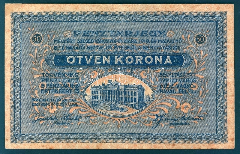 Szeged 1918. Pénztárjegy 50K-ról, sötétebb nyomat! T:II- rozsdafoltos https://www.darabanth.com/de/93-Fernauktion/93.0/Numismatik/~5314/Szeged-1918-Penztarjegy-50K-rol-sotetebb-nyomat-TII-rozsdafoltos~II214396