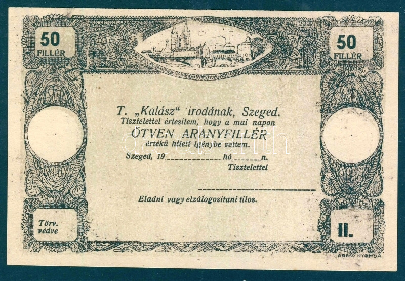 Beschreibung: Szeged DN 19.. "Kalász" 50f, bélyegzés nélkül! T:I