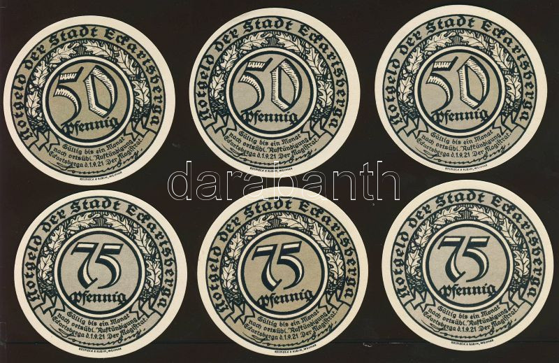 Német Birodalom/Weimari Köztársaság/ Eckartsberga 1921. 50Pf(3x) + 75P... https://www.darabanth.com/de/93-Fernauktion/93.0/Numismatik/~5315/Nemet-BirodalomWeimari-Koztarsasag-Eckartsberga-1921-50Pf3x-plus-75Pf3x-osszesen-6klf-db-t~II211081