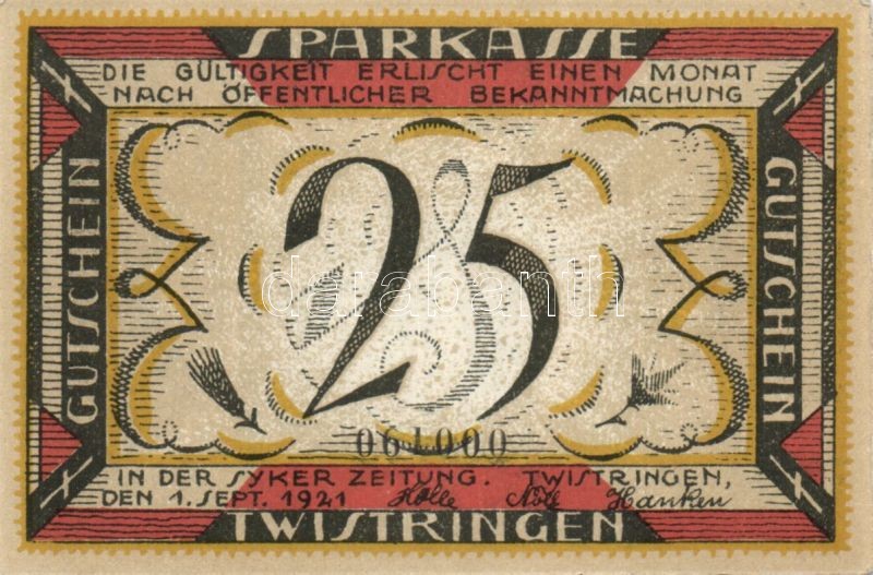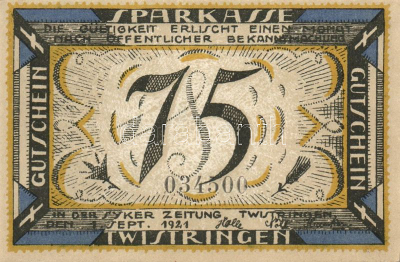 Német Birodalom/Weimari Köztársaság/ Twistringen 1921. 25Pf + 50Pf + 7... https://www.darabanth.com/de/93-Fernauktion/93.0/Numismatik/~5315/Nemet-BirodalomWeimari-Koztarsasag-Twistringen-1921-25Pf-plus-50Pf-plus-75Pf-3klf-db-teljes-sor-T~II209481