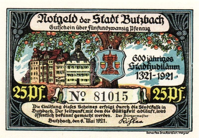 Német Birodalom/Weimari Köztársaság/Butzbach 1921. 25Pf, 50Pf(7x) 8klf... https://www.darabanth.com/de/93-Fernauktion/93.0/Numismatik/~5315/Nemet-BirodalomWeimari-KoztarsasagButzbach-1921-25Pf-50Pf7x-8klf-db-teljes-sor-T1~II214278