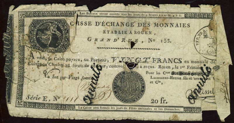 Beschreibung: Franciaország / Rouen 1797-1803. 20Fr T:IV- R!