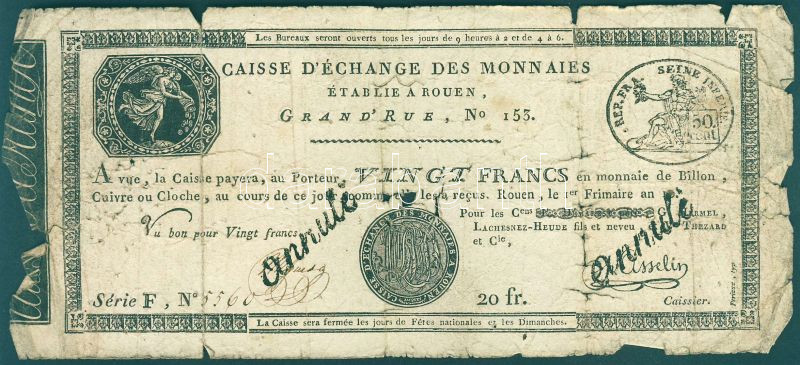 Beschreibung: Franciaország/Rouen 1797-1803. 20Fr T:IV- R!