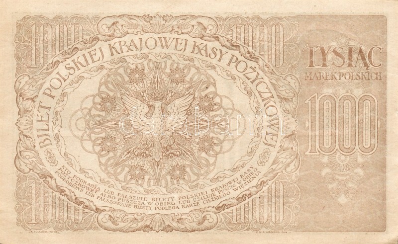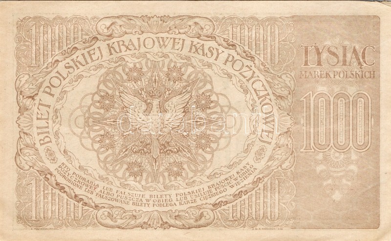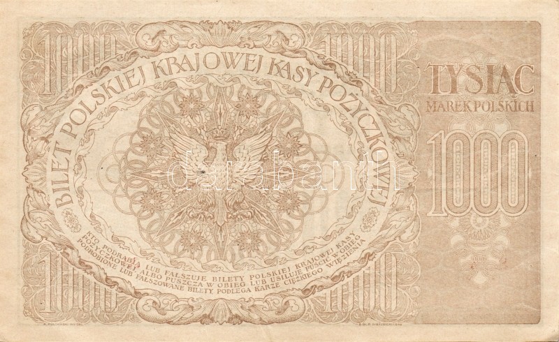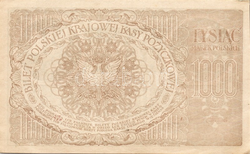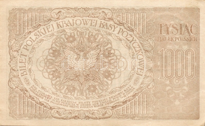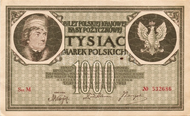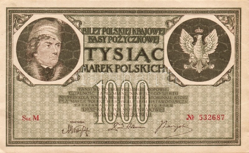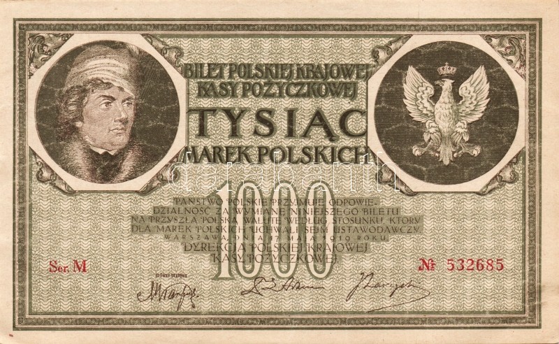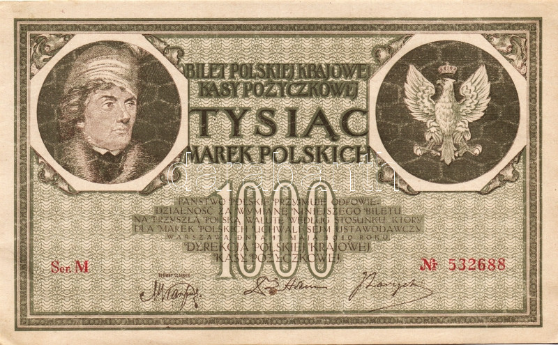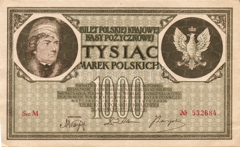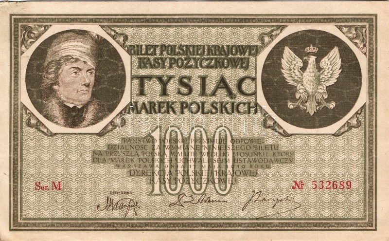 Lengyelország 1919. 1000M(6x)egymásutáni sorszámokkal T:II+ https://www.darabanth.com/de/93-Fernauktion/93.0/Numismatik/~5316/Lengyelorszag-1919-1000M6xegymasutani-sorszamokkal-TIIplus~II212832