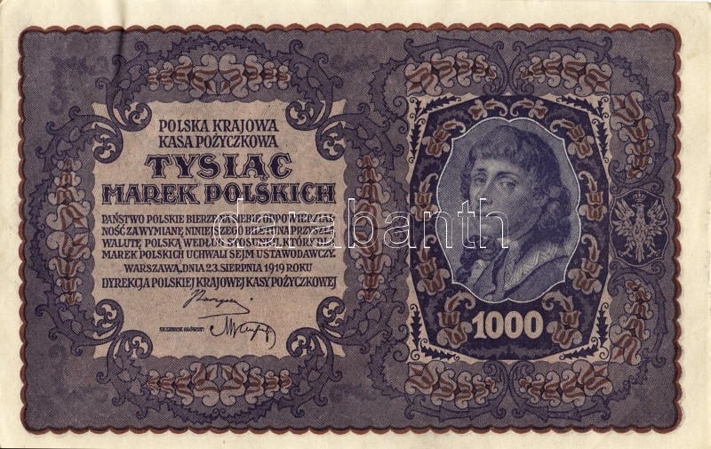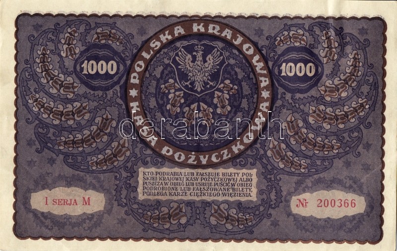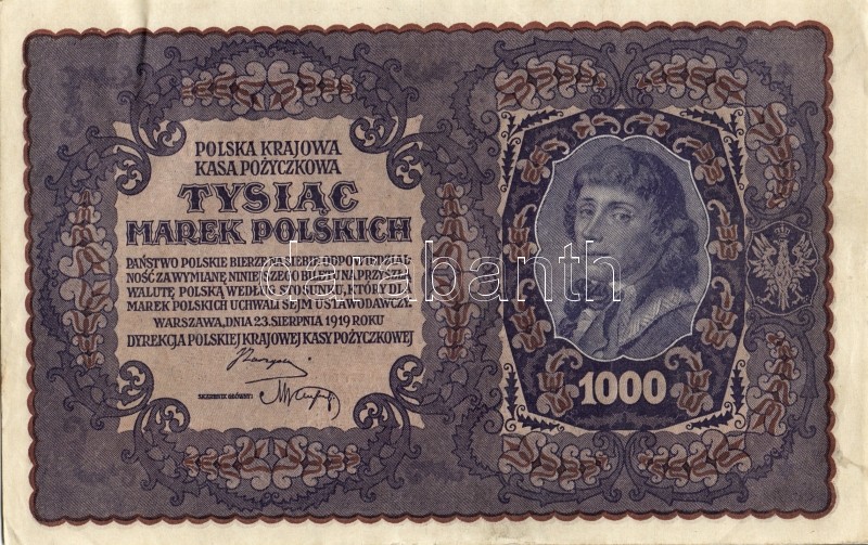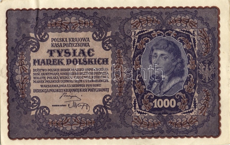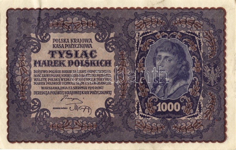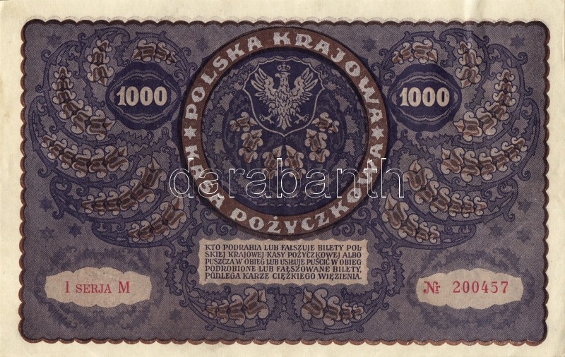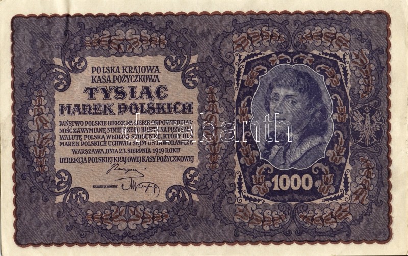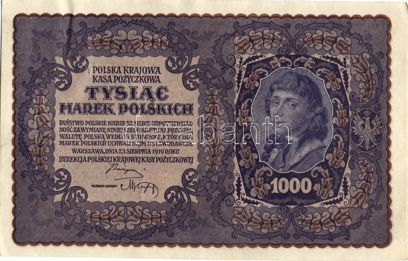 Lengyelország 1919. 1000M(8x) egymásutáni ill. kevés ugrású sorszámokk... https://www.darabanth.com/de/93-Fernauktion/93.0/Numismatik/~5316/Lengyelorszag-1919-1000M8x-egymasutani-ill-keves-ugrasu-sorszamokkal-TIIplus-II~II212983