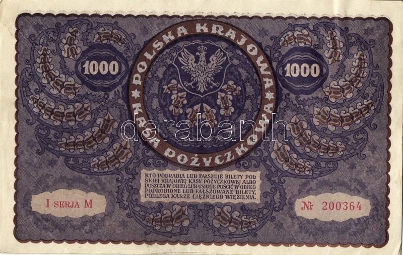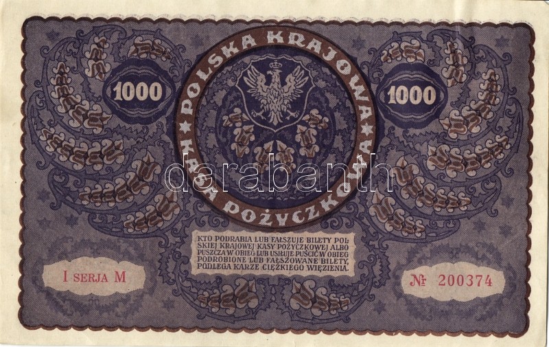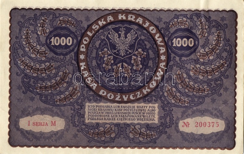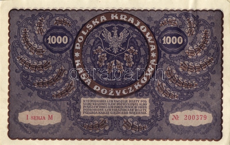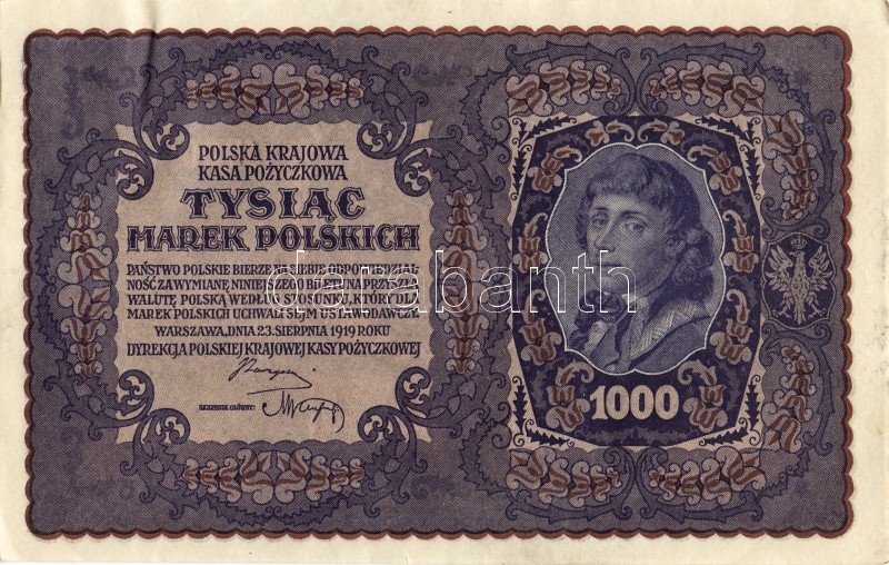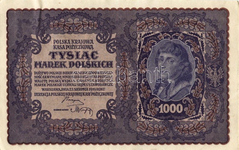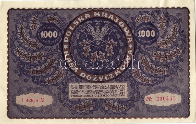 Lengyelország 1919. 1000M(8x) egymásutáni ill. kevés ugrású sorszámokk... https://www.darabanth.com/de/93-Fernauktion/93.0/Numismatik/~5316/Lengyelorszag-1919-1000M8x-egymasutani-ill-keves-ugrasu-sorszamokkal-TIIplus-II~II212983