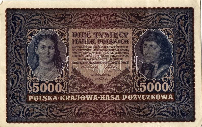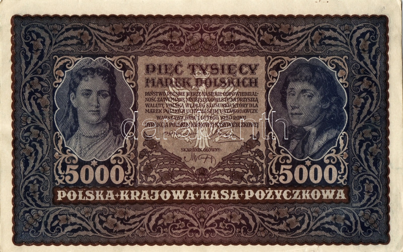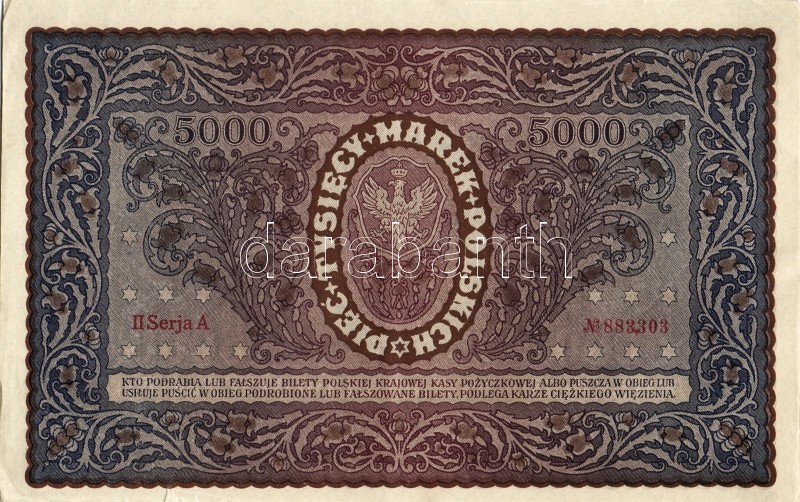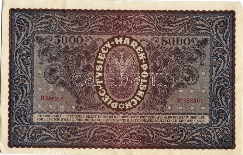 Lengyelország 1920. 5000M(2x) egymásutáni sorszámokkal T:III https://www.darabanth.com/de/93-Fernauktion/93.0/Numismatik/~5316/Lengyelorszag-1920-5000M2x-egymasutani-sorszamokkal-TIII~II212982