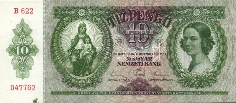 Beschreibung: 1936. 10P (2x) egymásutáni sorszámmal, egyiken erős, másikon kis zöld festékfolttal! T:I