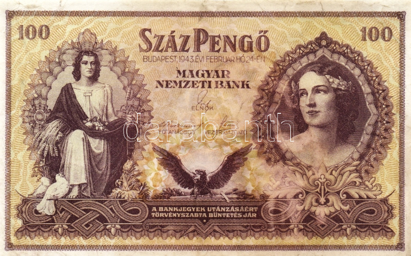 1943. 100P "Szálasi" T:I- foltos https://www.darabanth.com/de/93-Fernauktion/93.0/Numismatik/~5317/1943-100P-Szalasi-TI-foltos~II212754