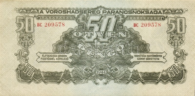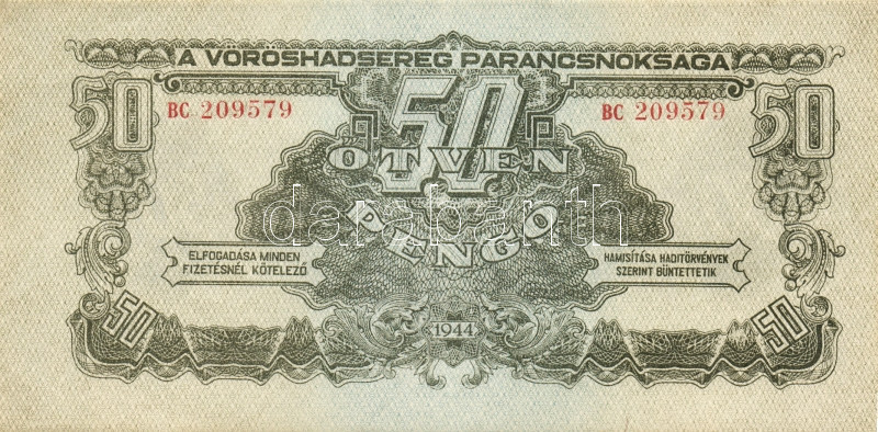1944. 50P "V.H." (2x) egymásutáni sorszámmal T:I,I- pici saroktörés https://www.darabanth.com/de/93-Fernauktion/93.0/Numismatik/~5317/1944-50P-VH-2x-egymasutani-sorszammal-TI-I-pici-saroktores~II212757