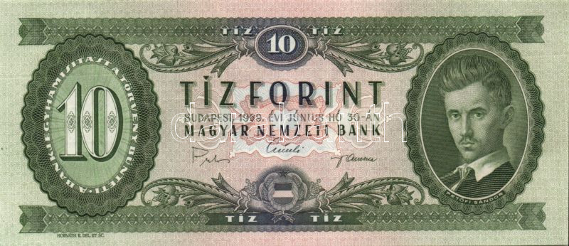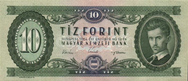 1962. 10Ft bal alsó sarokban kis papírránccal, egyenetlen sorszámmal + 1969. 10Ft vízszintesen átfutó gyári bemélyedéssel és egyenetlen sorozatszámmal T:I