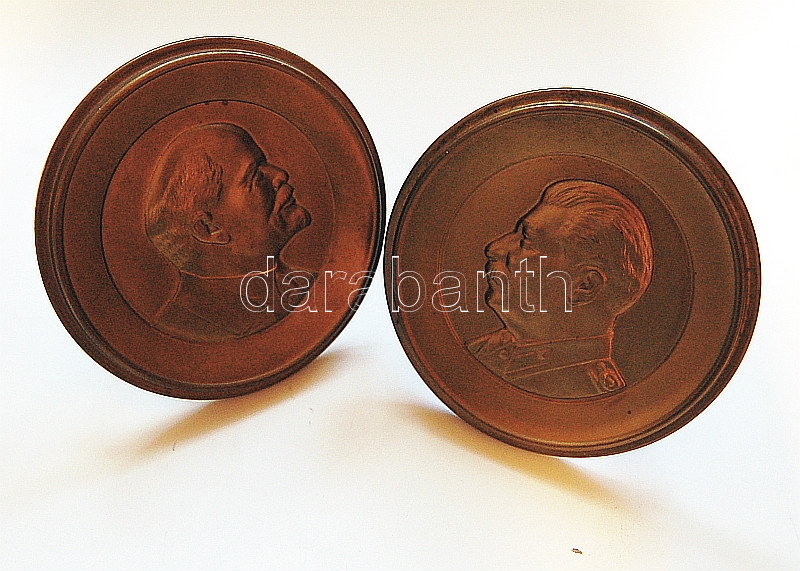 Beschreibung: CCa. 1950-es évek DN "Sztálin" + "Lenin" akasztható, ill. kitámasztható aranyozott fém kisplasztika-pár, hátoldala bakelit T:1 RR!!