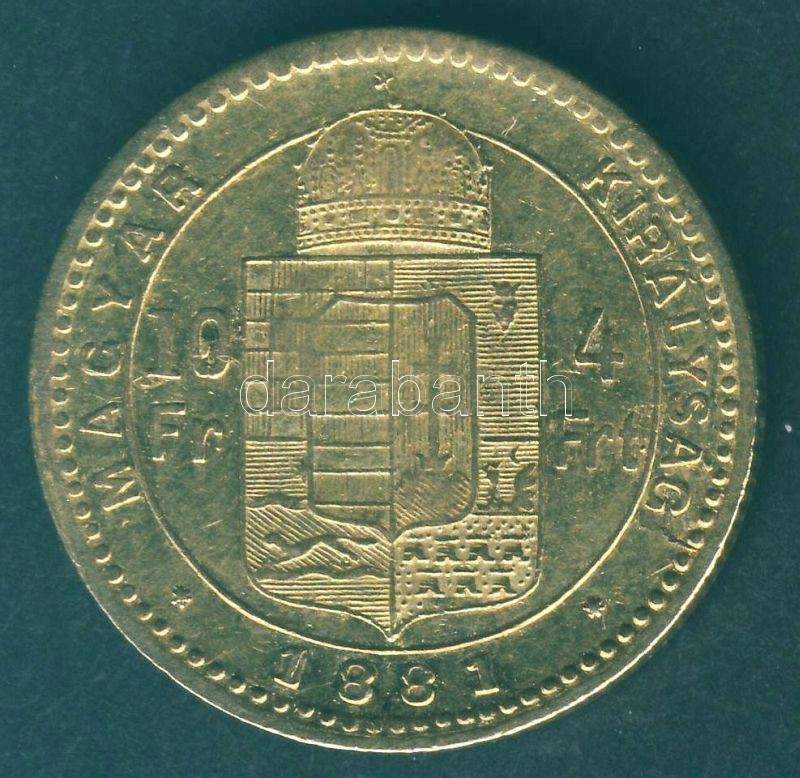 1881. 4Ft Au 3,2258g T:1/2+ https://www.darabanth.com/de/93-Fernauktion/93.0/Numismatik/~5321/1881-4Ft-Au-3-2258g-T12plus~II214448