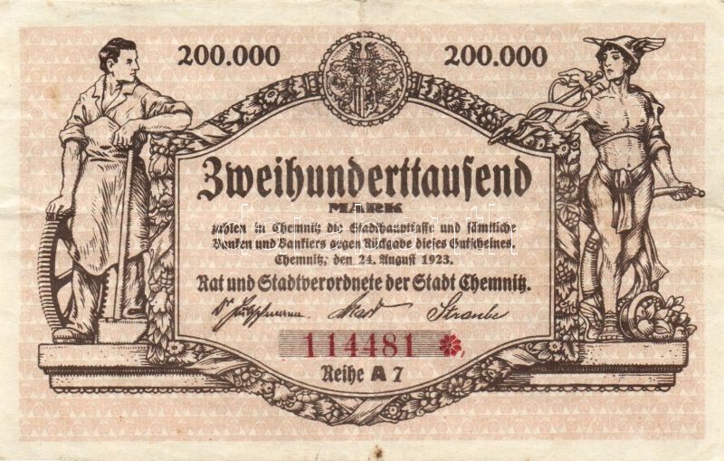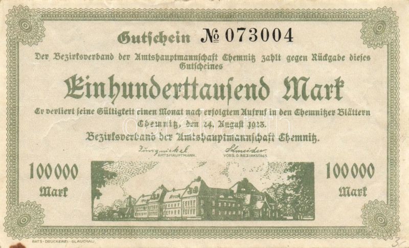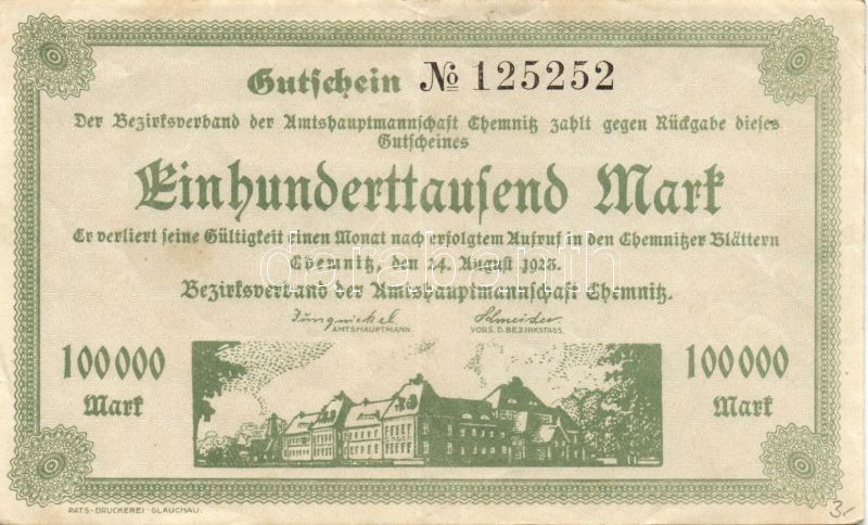 Beschreibung: Német Birodalom/Weimari Köztársaság/Chemnitz/Bezirkverband der Amtshauptmannschaft 1923. 100.000M (2x), 200.000M, 2000.000M T:II,II/III Összesen 4db!