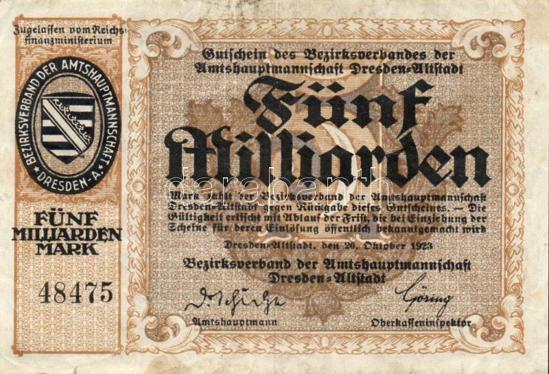 Német Birodalom/Weimari Köztársaság/Dresden-Altstadt 1923. 5000.000.00... https://www.darabanth.com/de/94-Fernauktion/94.0/Numismatik/~274/Nemet-BirodalomWeimari-KoztarsasagDresden-Altstadt-1923-5000000000M-TIII-~II215232