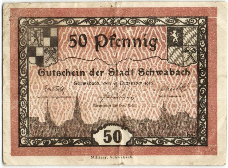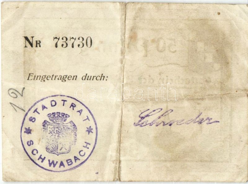 Német Birodalom/Weimari Köztársaság/Schwabach 1918.12.15. 50Pf T:III https://www.darabanth.com/de/94-Fernauktion/94.0/Numismatik/~274/Nemet-BirodalomWeimari-KoztarsasagSchwabach-19181215-50Pf-TIII~II215643
