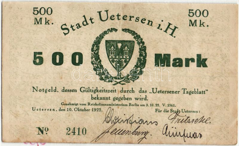 Német Birodalom/Weimari Köztársaság/Uetersen 1922.10.12. 500M T:II- fo... https://www.darabanth.com/de/94-Fernauktion/94.0/Numismatik/~274/Nemet-BirodalomWeimari-KoztarsasagUetersen-19221012-500M-TII-foltos~II215641
