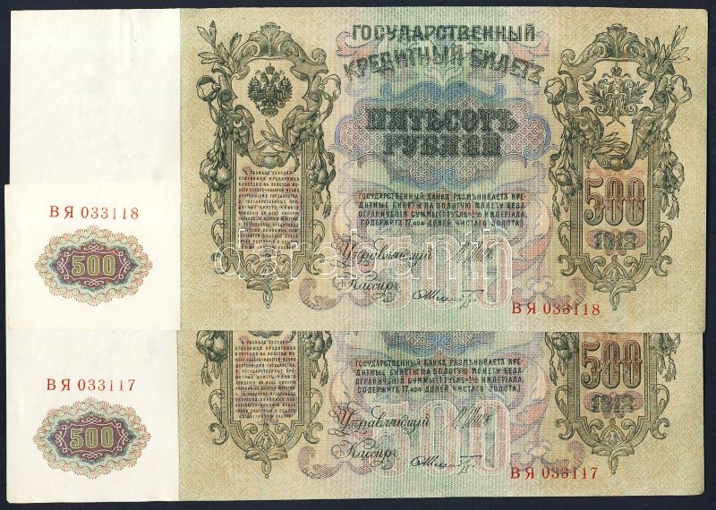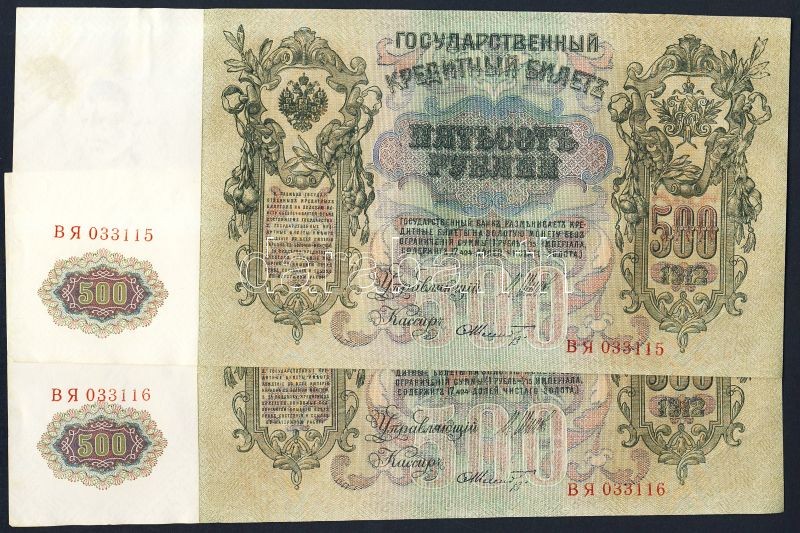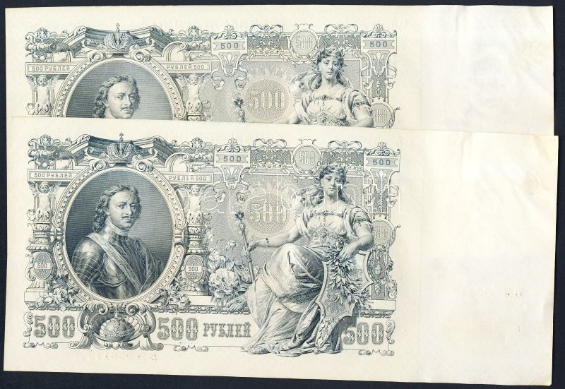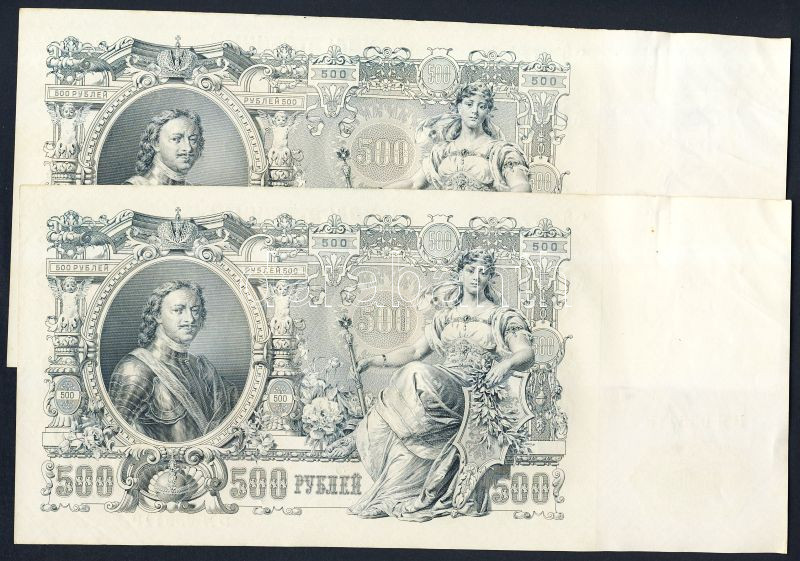 Oroszország 1912. 500R(4x) egymásutáni sorszámokkal T:I,I- https://www.darabanth.com/de/94-Fernauktion/94.0/Numismatik/~275/Oroszorszag-1912-500R4x-egymasutani-sorszamokkal-TI-I-~II216546