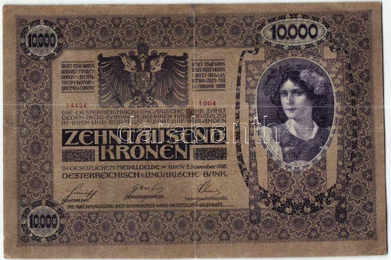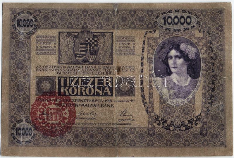 1918. 10.000K piros "Magyarország" körbélyegzővel T:III- https://www.darabanth.com/de/94-Fernauktion/94.0/Numismatik/~285/1918-10000K-piros-Magyarorszag-korbelyegzovel-TIII-~II216288