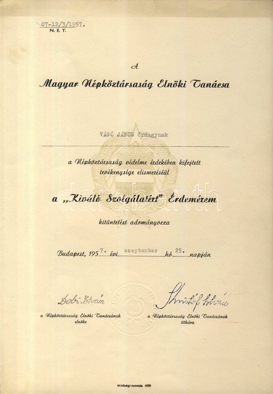 1957 Dobi István az Elnöki Tanács elnökének aláírása katonai oklevélen https://www.darabanth.com/de/95-Fernauktion/95.0/Andere-Sammelgebiete/~334/1957-Dobi-Istvan-az-Elnoki-Tanacs-elnokenek-alairasa-katonai-oklevelen~II196930