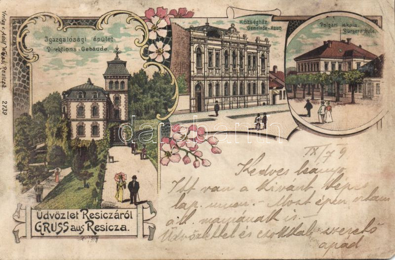 Resicza Headquarters, Town Hall, School Litho https://www.darabanth.com/de/95-Fernauktion/95.0/Ansichtskarten/~347/Resicza-Headquarters-Town-Hall-School-Litho~II218423