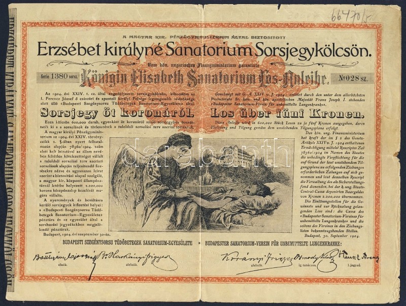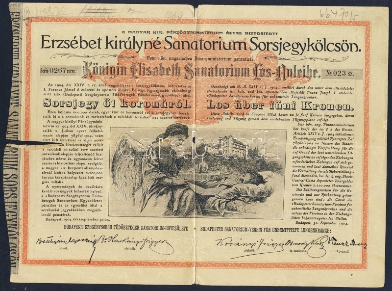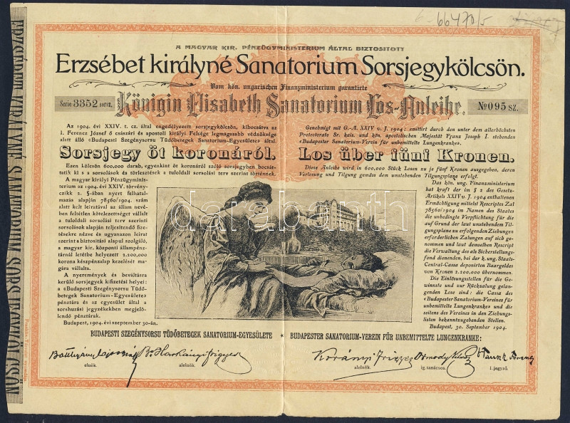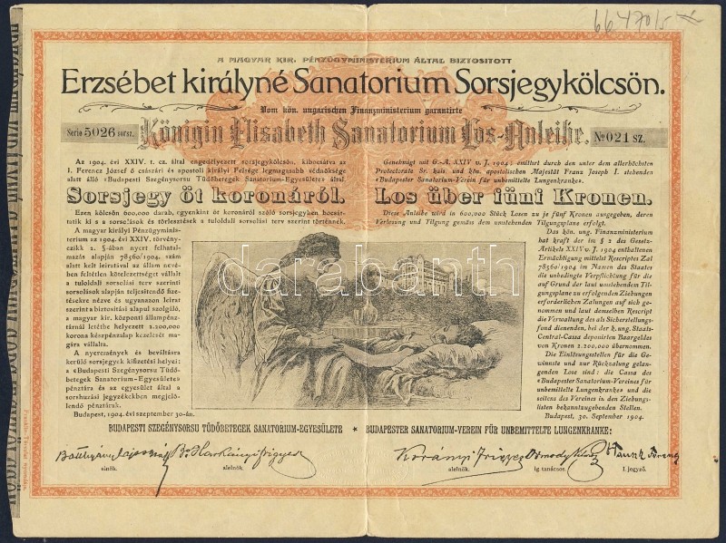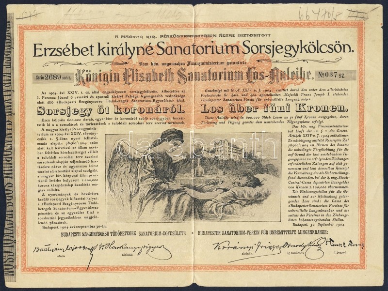 1904. "Erzsébet királyné Sanatorium Sorsjegykölcsön" sorsjegye 5K-ról ... https://www.darabanth.com/de/95-Fernauktion/95.0/Numismatik/~377/1904-Erzsebet-kiralyne-Sanatorium-Sorsjegykolcson-sorsjegye-5K-rol-5x~II216059