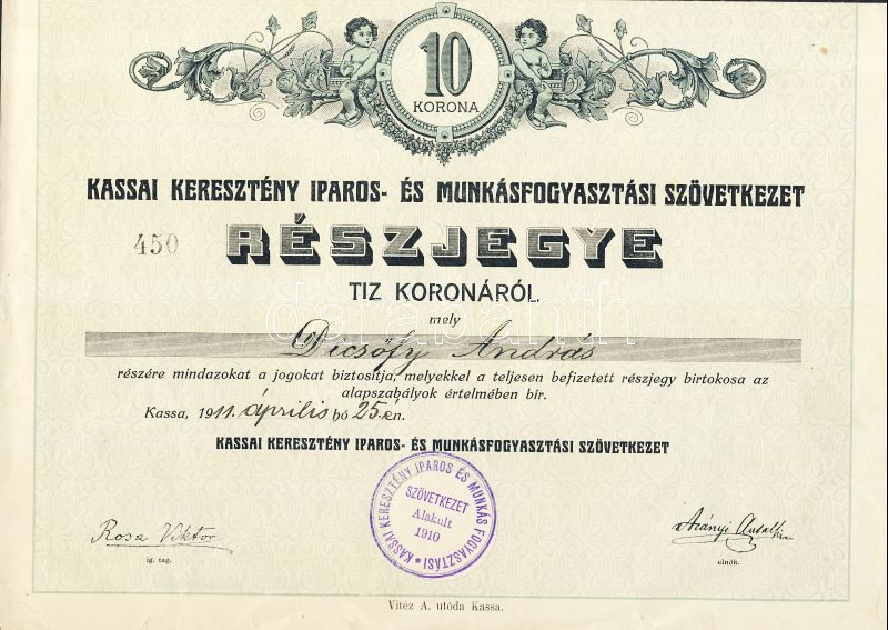 1911. "Kassai Keresztény Iparos- és Munkásfogyasztási Szövetkezet" rés... https://www.darabanth.com/de/95-Fernauktion/95.0/Numismatik/~377/1911-Kassai-Kereszteny-Iparos-es-Munkasfogyasztasi-Szovetkezet-reszjegye-10K-rol-szelve~II216991